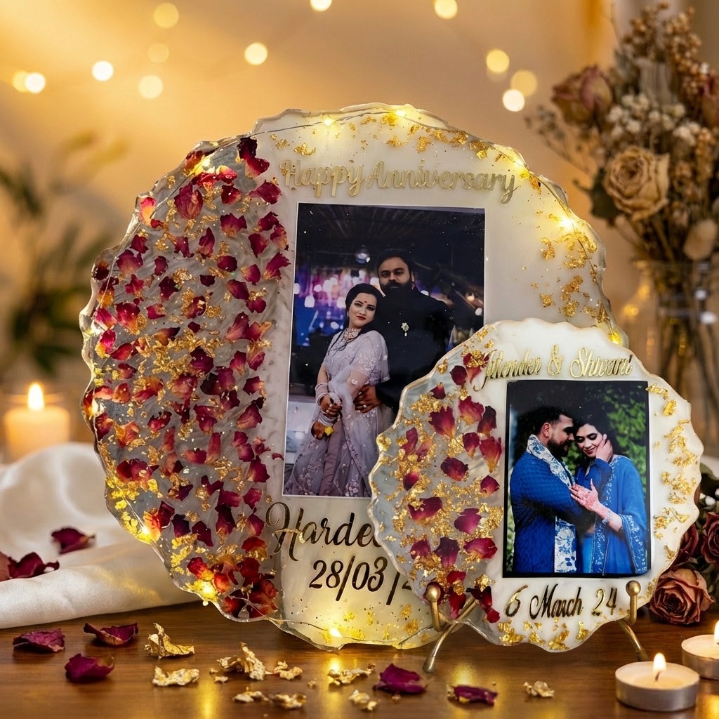 Customized LED Anniversary Photo Frame with Resin Art & Dried Roses
