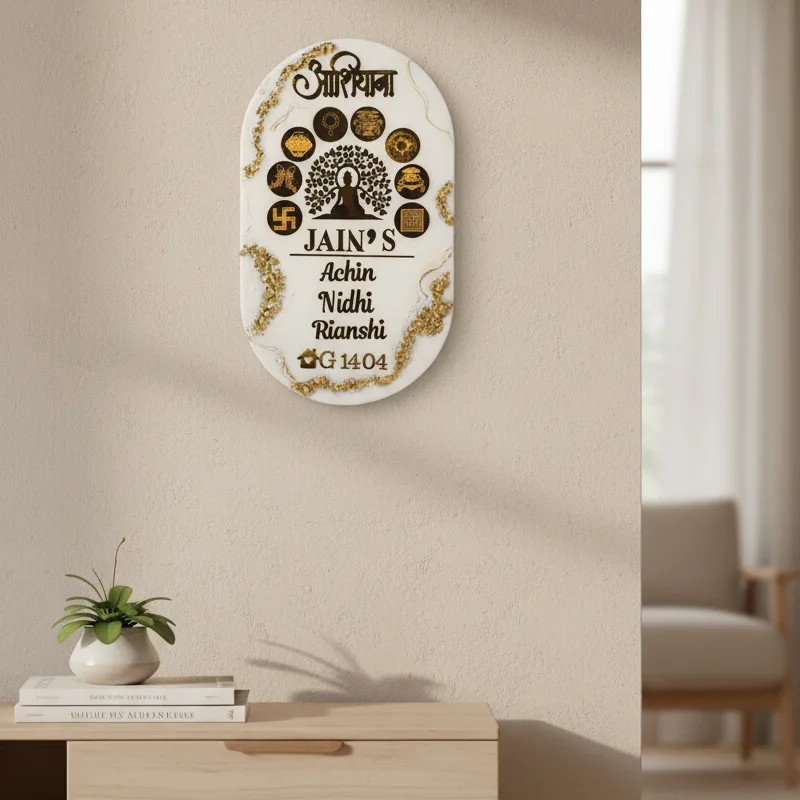 Bring elegance and spirituality to your entrance with our Customized Premium Resin Name Plate – Spiritual Theme (Arch Top Rectangle). Crafted with an MDF–Acrylic base and golden 3D acrylic letters, it’s ideal for homes, offices, villas, or receptions, Worship Area offering both beauty and durability for indoor or outdoor use.