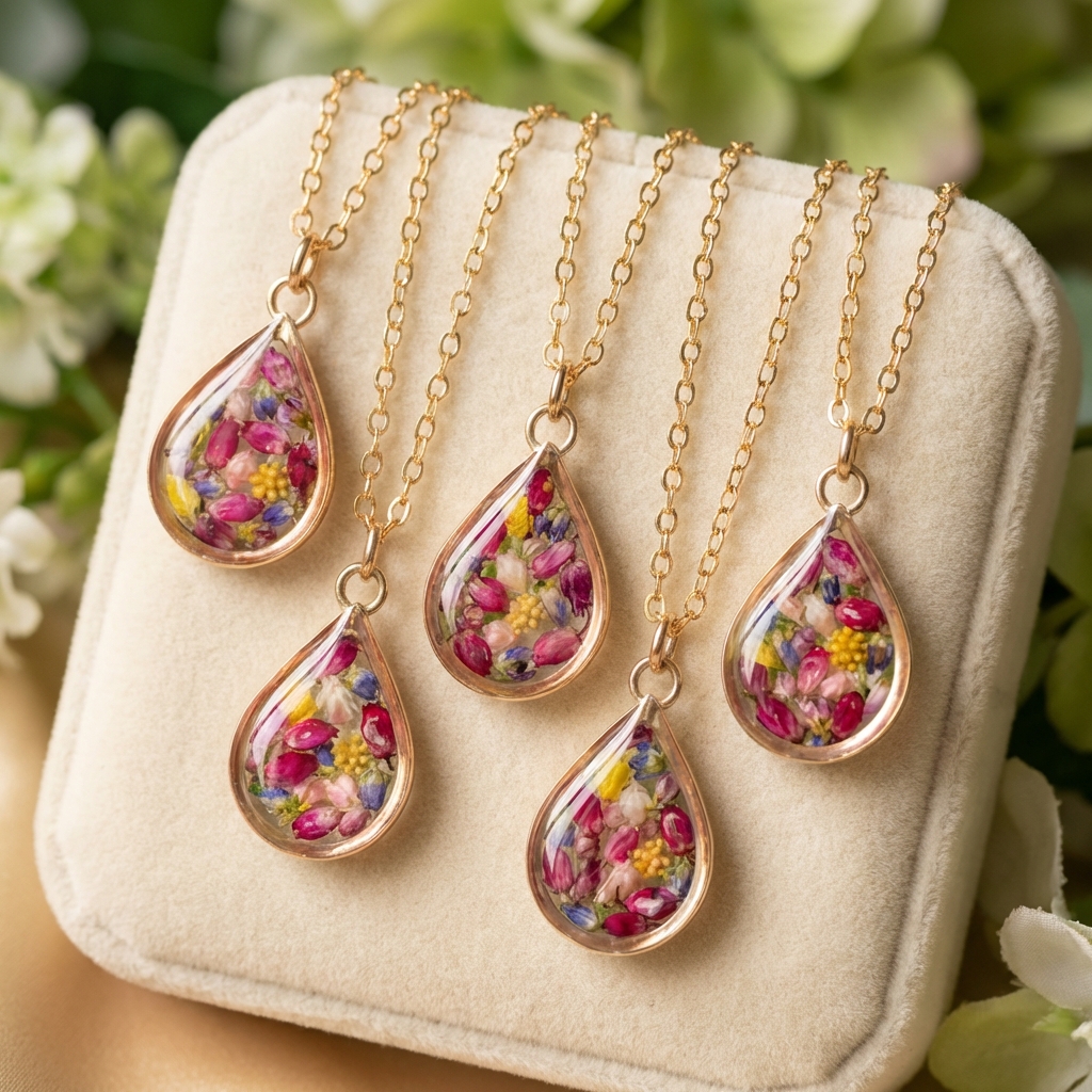Each pendant is carefully made using real dried flowers preserved in high-quality resin, making every piece truly unique and timeless.